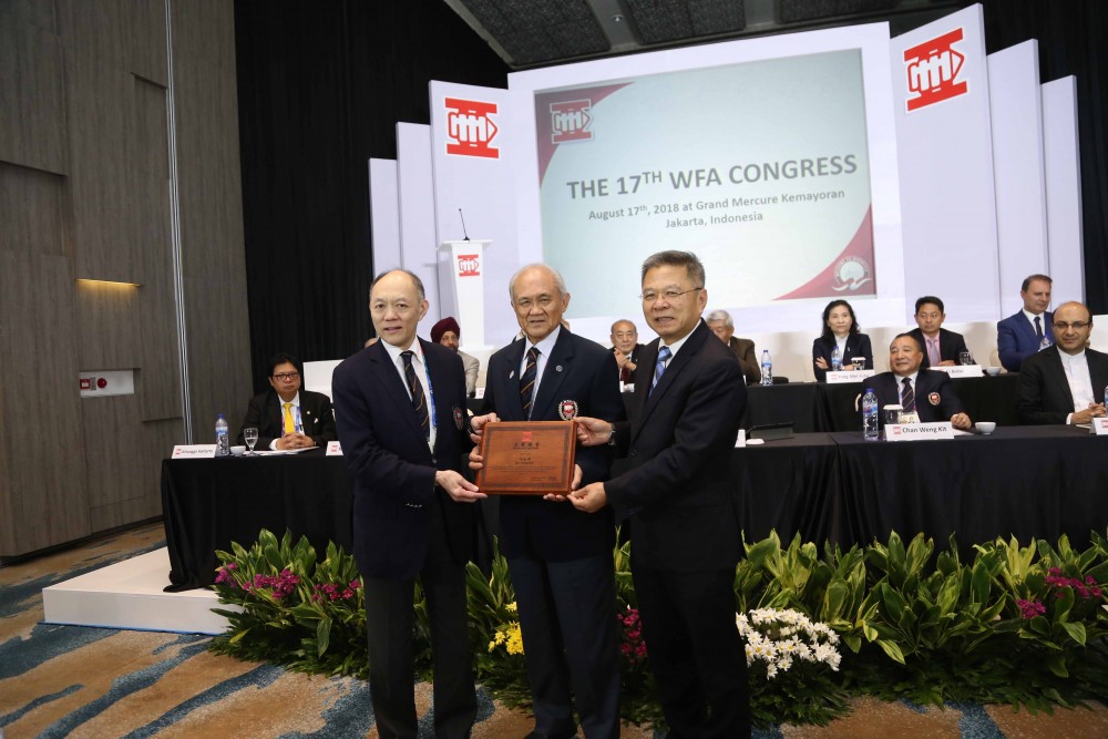 Last, WFA has granted Honorary Vice-President to Kyuhei Muraoka (Japan) and Kee Yong Wee (Malaysia) in appreciation for their contribution in the development of wushu in Asia over the past years. Kyuhei Muraoka was absent due to physical conditions, the honorary certificate was accepted by Okazaki Yutaka on his behalf. Further, Mohammadreza Pourgholaminejad (Iran) will soon be leaving his position, certificate of appreciation is awarded to his service for the past 20 years.